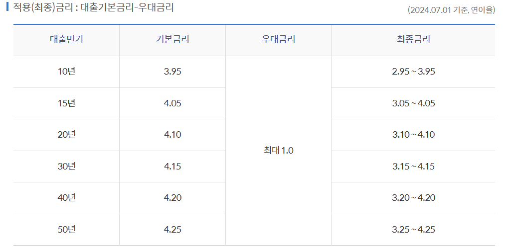 - 대출기간: 10년, 15년, 20년, 30년, 40년, 50년 중 선택할 수 있습니다. 단, 40년 및 50년 만기는 특정 조건을 충족해야 합니다.