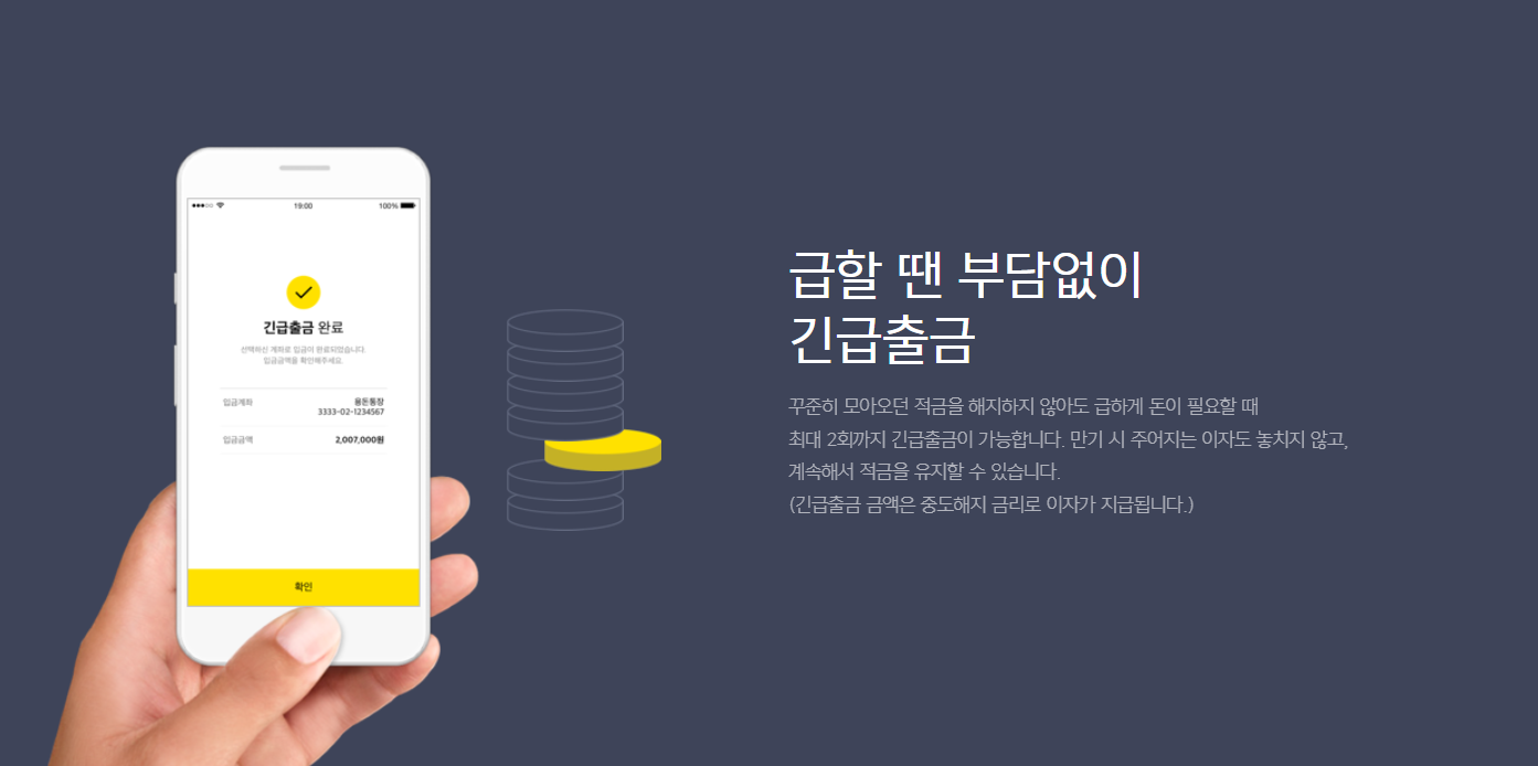 카카오뱅크의 자유적금은 다른 정액 적금과 달리, 매달 꼭 일정 금액을 넣지 않아도 적금을 유지할 수 있는 장점이 있으며 특히 긴급출금이 2회까지 가능하니 참고하시기 바랍니다.