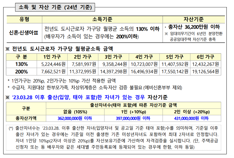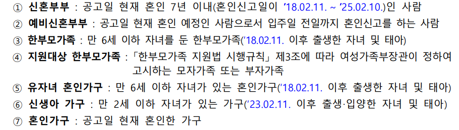 모집공고일 현재(2025.02.10.) 무주택세대구성원으로서 신혼·신생아 매입임대주택 소득 및 자산기준을 충족하고, 아래의 ①~⑦ 중 하나에 해당하는 사람만 지원이 가능합니다.