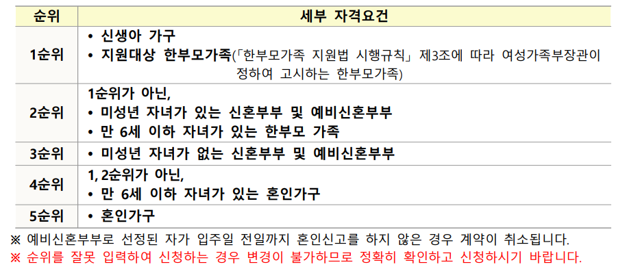 | 선정기준 | 순위별 선정(1순위 : 신생아가구, 지원대상한부모가족/2순위 : 신혼부부, 한부모가족 등) |