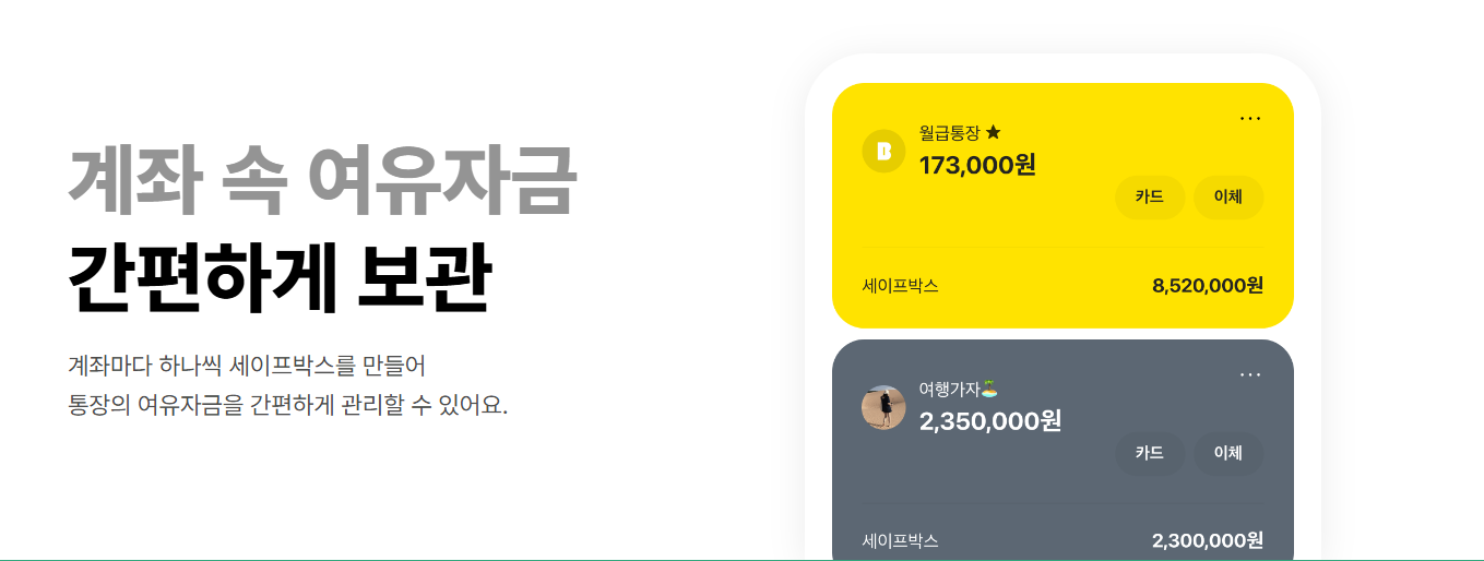 • 자금의 안전한 보관: 세이프박스는 주 계좌와는 별개로 자금을 분리하여 보관할 수 있으므로, 큰 지출이 예상될 때 자금을 미리 보관해두거나, 비상용 자금을 따로 관리하는 데 유용합니다.