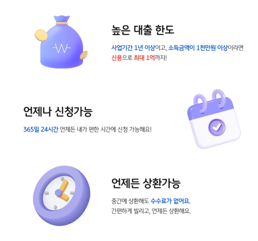 - 최대 1억원으로 대출한도는 고객 신용등급, 소득금액 등에 따라 다르게 적용됩니다.